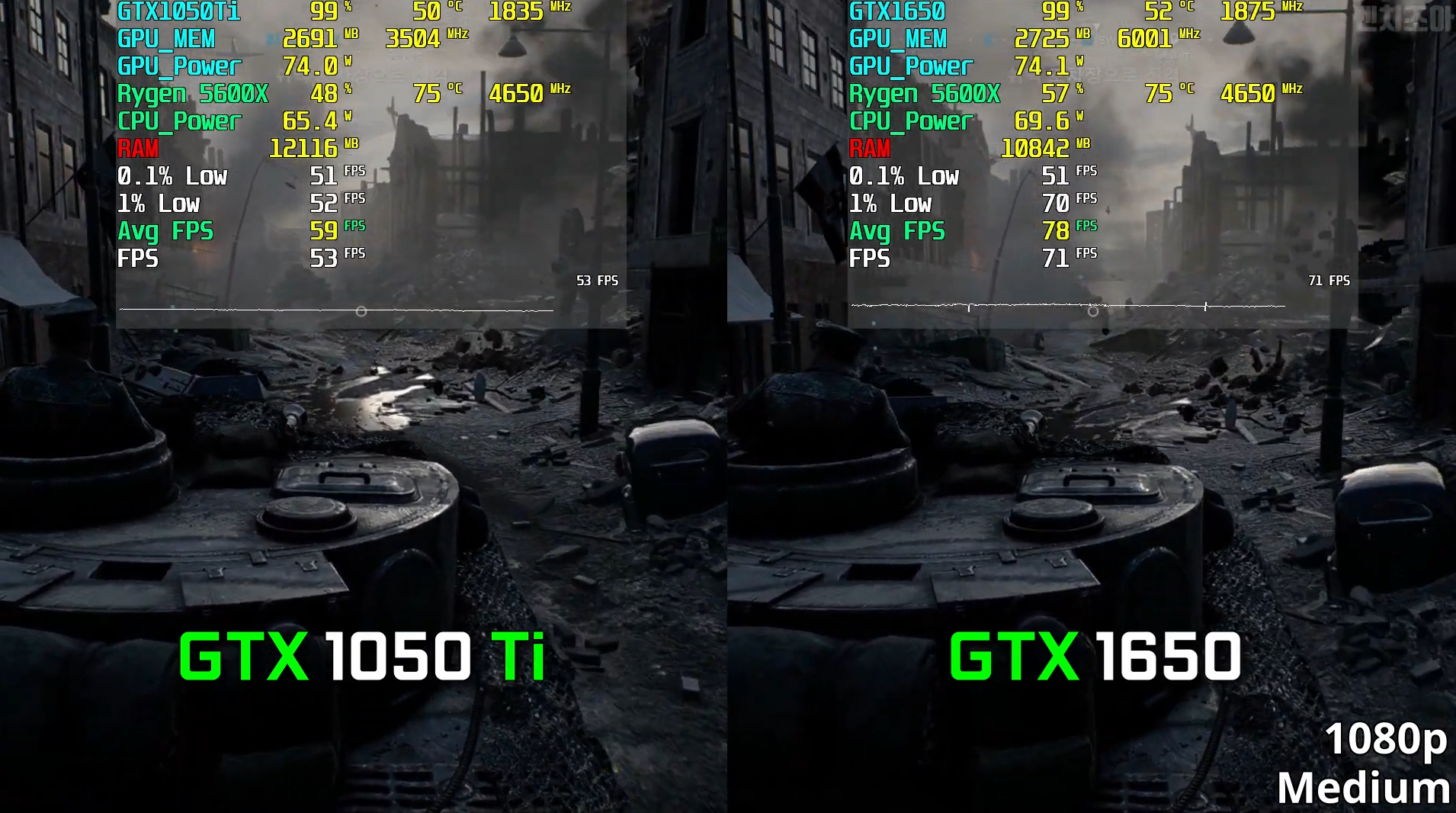 배틀필드 5 에서 플레이한 사진을 확인해 보시면 GTX 1650의 평균 프레임이 GTX 1050 Ti 보다 18 정도 더 앞서는 것을 확인하실 수 있습니다. GTX 1050 Ti가 전성비가 좋았지만 고사양 게임에서는 힘을 못 내주는 모습을 보여주고 있네요.