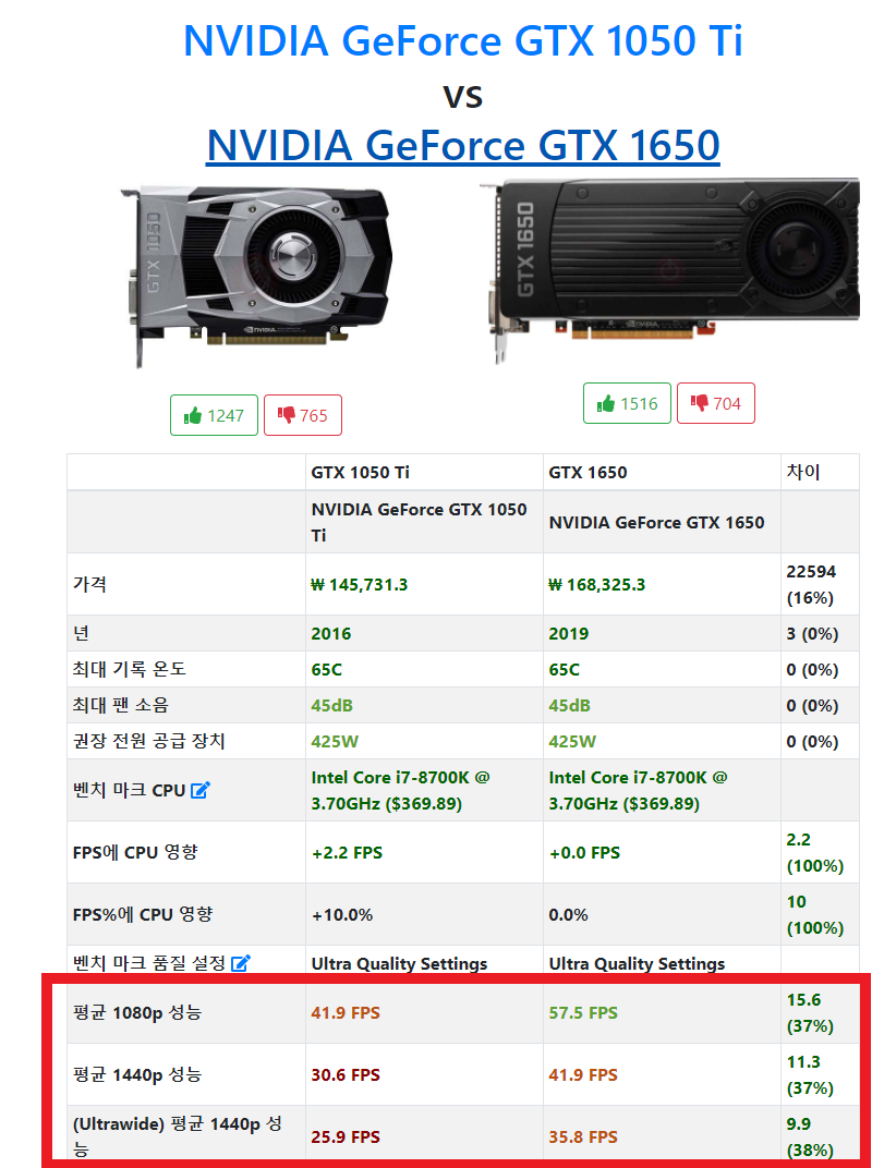 파스칼에서 극강의 전성비로 이름을 날렸던 GTX 1050 Ti와 튜링 세대의 50 라인업을 맡은 GTX 1650에 대한 비교를 해보고자 합니다. 둘 다 저전력이라서 보조전력 없이 메인보드에만 껴서 사용할 수 있는 가벼운 그래픽카드 이죠.