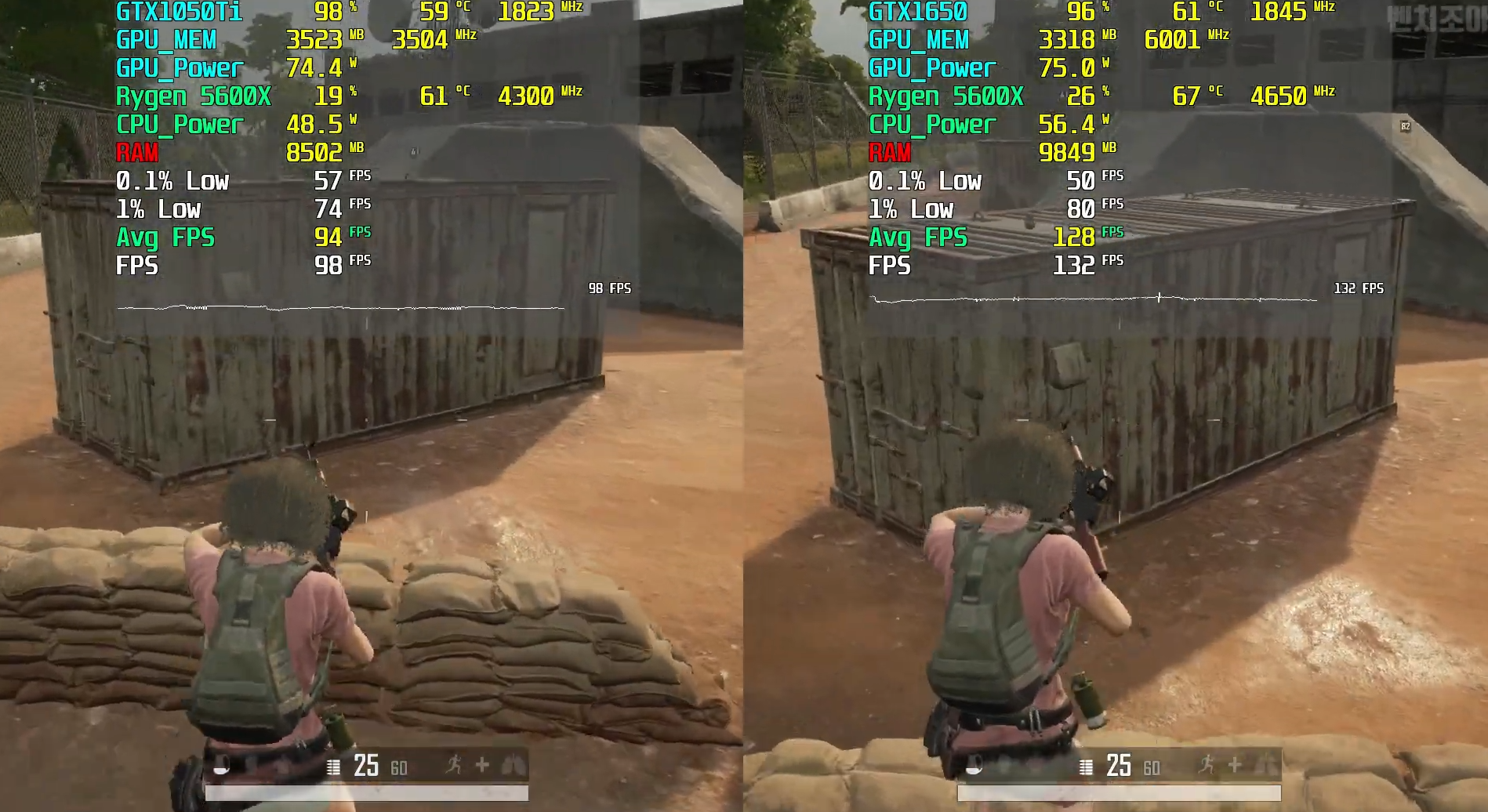 배틀그라운드에서는 더 큰 격차를 보여주며 GTX 1650이 약 30% 정도 더 우세한 모습을 보여주었습니다. 그렇지만 국민옵션 정도면은 GTX1050 Ti도 충분히 평균 프레임 60 이상을 보여주었으니 GTX1050 Ti도 나름 괜찮은 그래픽카드라고 생각됩니다.