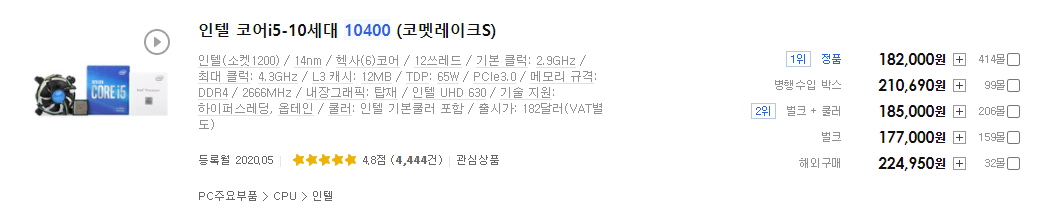 심지어 i7 9700F의 출시가는 약 300달러, 인텔 i5 10400의 출시가는 182달러로, 차이가 120달러 한화로 약 13만원 정도 차이가 나네요. 저렇게 된 이유는 아마 AMD의 분발이 크지 않았나 싶습니다.