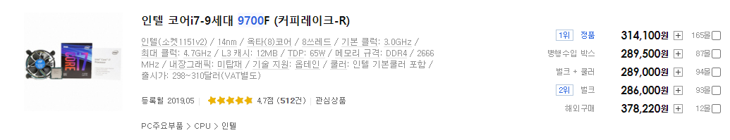 이로써 인텔 i7 9700(F)는 인텔 i5 10400에 비해 게임 성능이나 작업 면도에서 모두 밀리는 모습을 보여주고 있습니다. 그런데 가격은 12만원이나 더 비싸니 인텔 i7 9700F는 인텔 i5 10400이 출시하는 순간 선택 메리트가 없어지는 것을 확인할 수 있습니다.