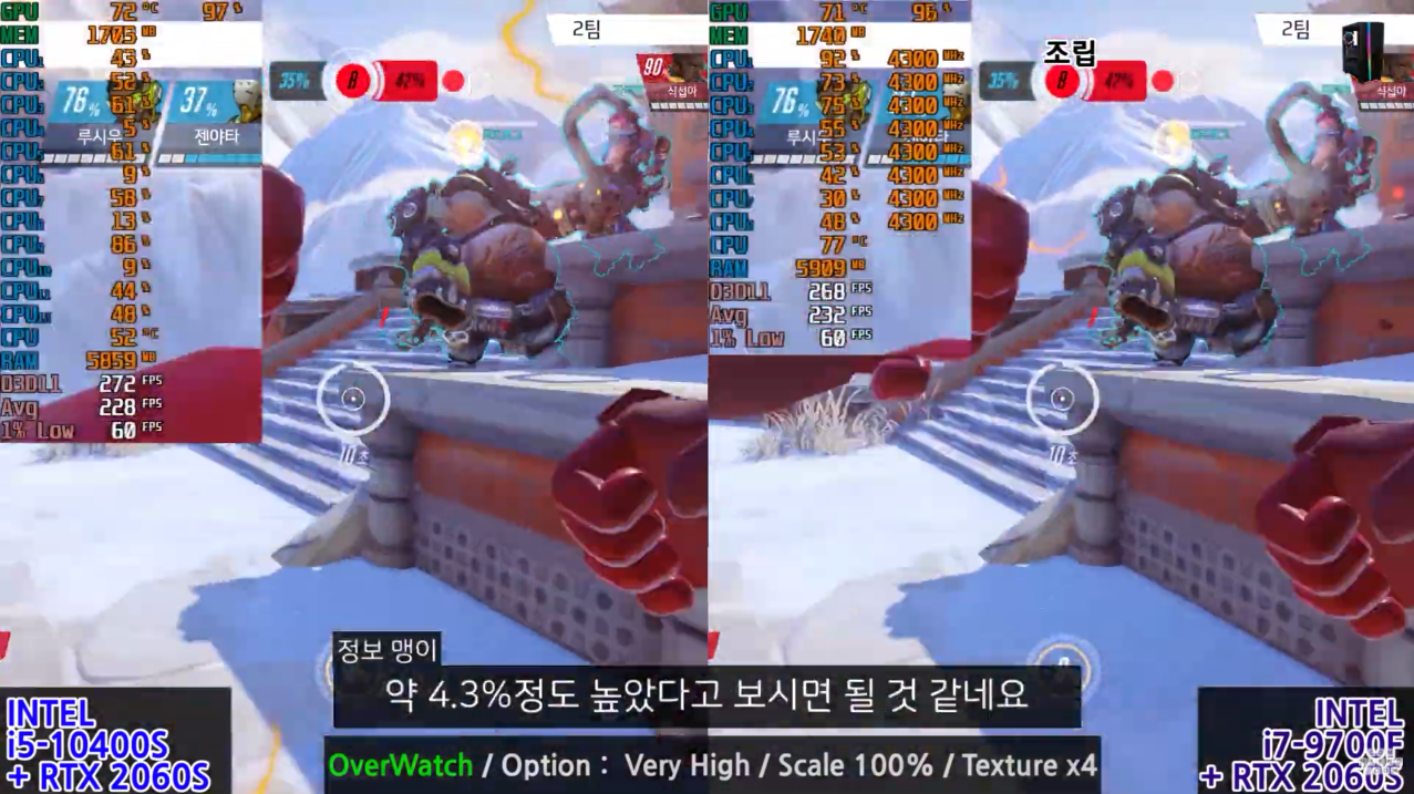오버워치에서도 역시 인텔 i7 9700F가 더 우세한 모습을 보여주었지만 평균 프레임은 4차이로, 인텔 i5 10400와 i7 9700F의 게이밍 성능은 그다지 차이가 나지 않는 것을 확인할 수 있습니다.