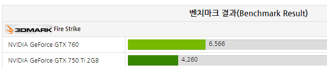 hwbattle 파이어 스트라이크 결과를 보시면 GTX750 TI 대비 50퍼 정도 증가한 성능을 알 수 있습니다. 요구사항 전력이 2배 이상 차이 나는 것에 비하면 큰 성능 증가는 아닌 것 같네요. 그만큼 GTX750 Ti의 전성비는 대단한 것 같습니다.