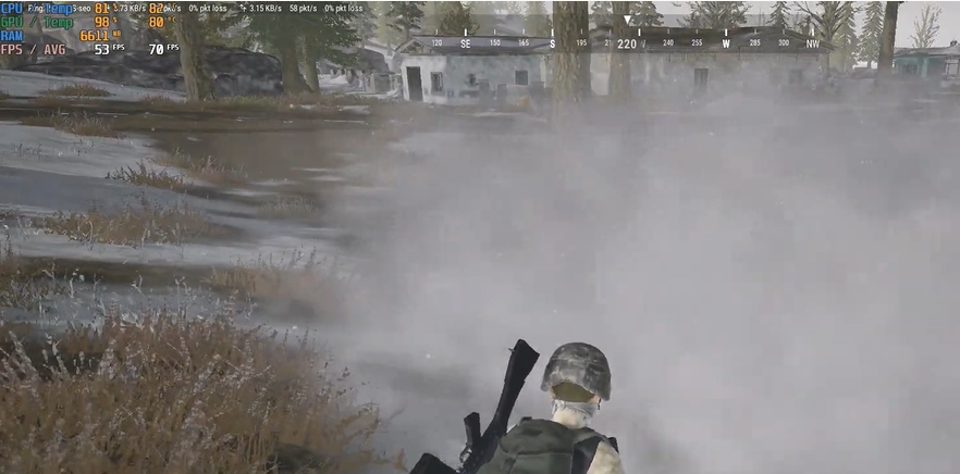 그렇다면 배틀그라운드에서 까지 잘 돌릴 수 있을까요? 잘은 아니지만 어느 정도 돌릴 수 있다! 입니다. 비행기에서 내리고 지상에 착륙할 때 60 선이 무너지지만 이후 꾸준히 60 이상을 방어해주고 교전 시에는 50 중반대로 떨어지는 모습을 보여주었습니다.