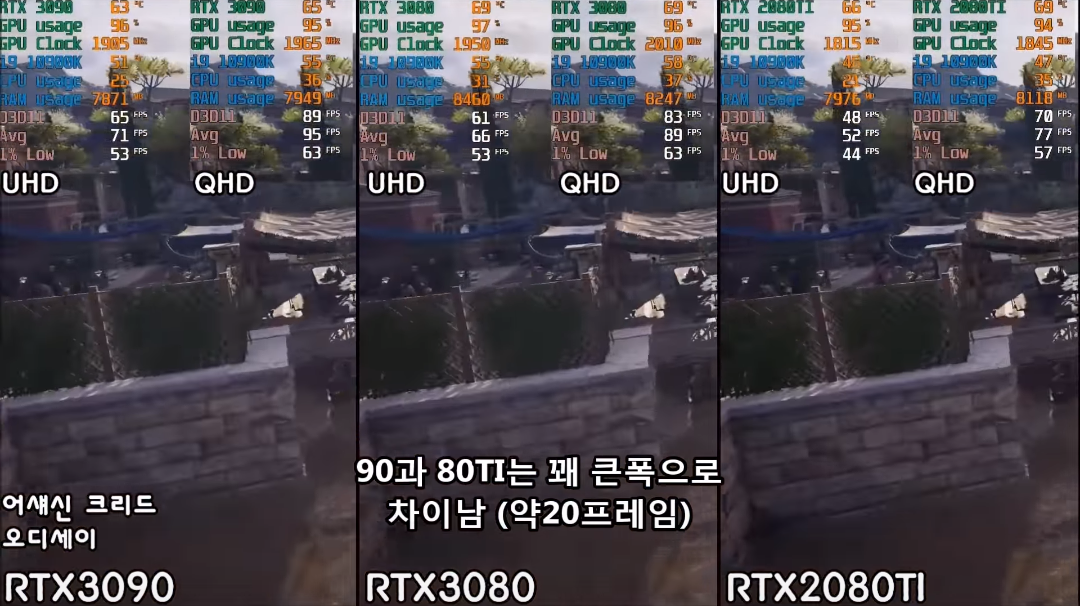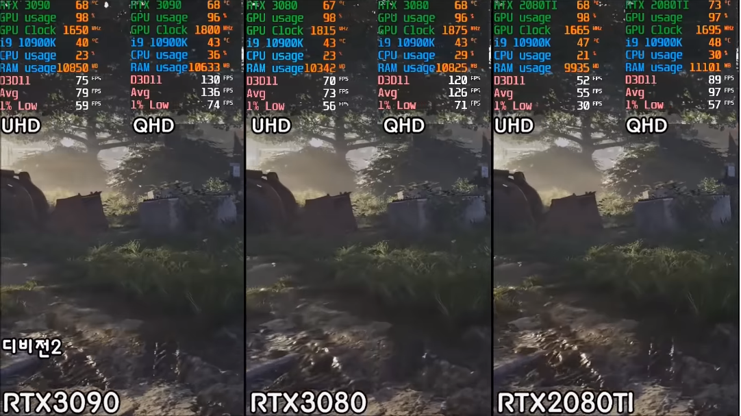 디비전 2에서도 RTX 3090과 RTX 3080은 8퍼, RTX 3080과 RTX 2080 Ti(RTX 3070)의 차이는 25퍼 정도로나오네요! 기정사실화 되는 듯 싶습니다. RTX 3090은 진정 전문가 용을 위한 그래픽 카드인 것인가..?? 어쩐지 RTX 타이탄의 네이밍을 RTX 3090으로 대체한 듯 느낌이 나는 그래픽 카드인 것 같습니다.