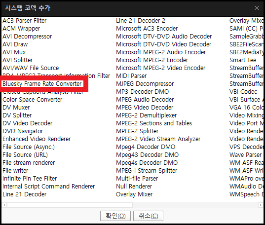 시스템 코덱 추가를 누르시고 Bluesky Frame Rate Converter를 클릭하여 확인을 누릅니다.