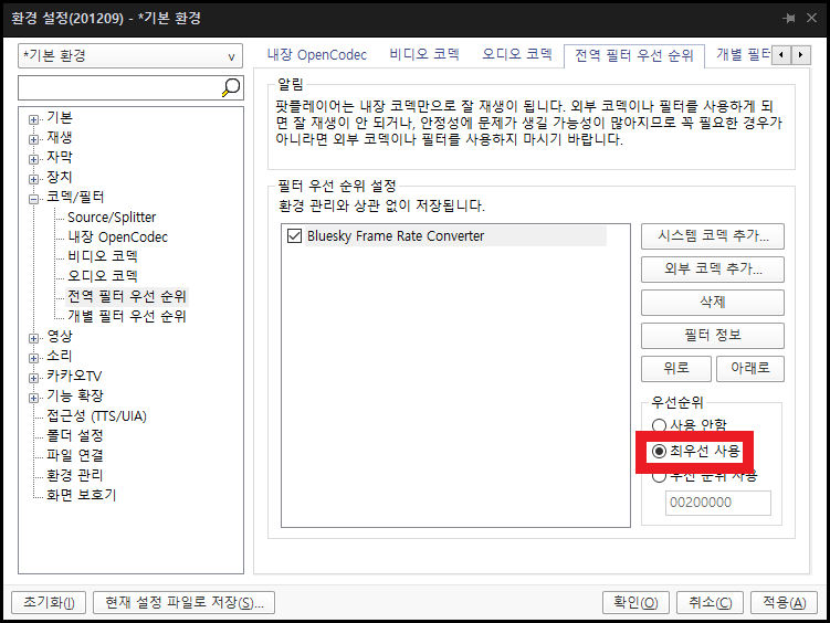 해당 Bluesky Frame Rate Converter가 추가된 것을 확인할 수 있습니다. 해당 항목을 클릭하면 우측 하단에 우선순위에 우선순위 사용에 클릭이 되어 있을 겁니다. 해당 필터를 우선적으로 사용하기 위해서 최우선 사용을 클릭하고 적용을 누른 후 확인을 누릅니다.