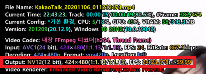 팟플레이어 동영상을 실행시킨 후 Tab 버튼을 누르면 중간에 Ouput 항목의 끝 부분을 보시면 FPS라는 부분이 있습니다. 위 사진에서 24(23.878) -> 59.99로 되어있으면 24 프레임의 동영상이 60 프레임으로 출력되고 있다는 의미이므로 적용이 된 것을 확인할 수 있습니다!