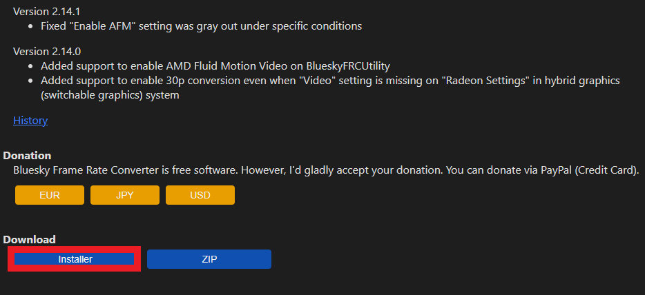 bluesky-soft.com/en/BlueskyFRC.html으로 들어가셔서 맨 아래로 스크롤을 내리시면 Download가 있으며 그 아래에 Installer 버튼이 있습니다. 해당 버튼을 클릭하여 프로그램을 다운로드합니다.