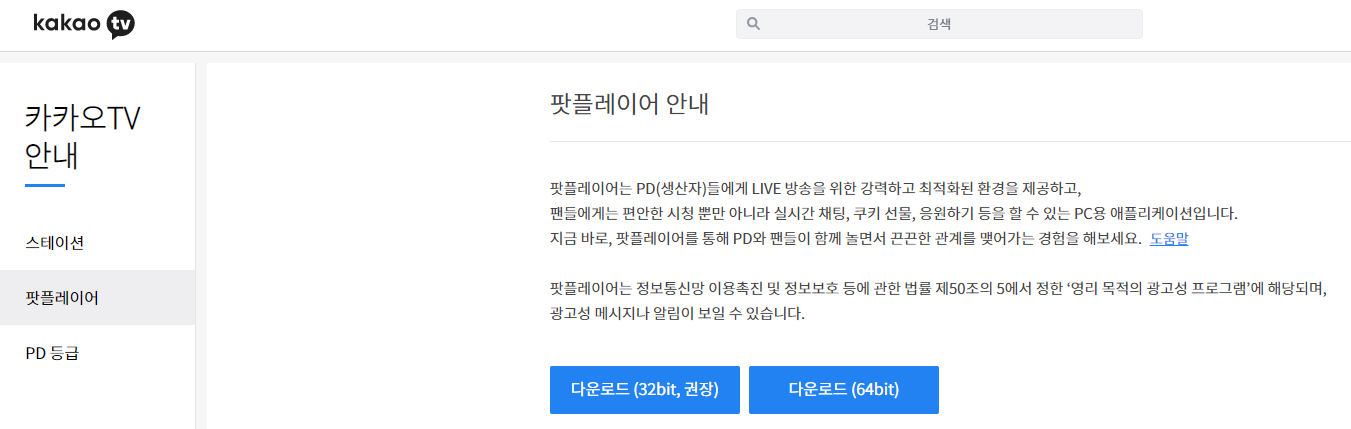 tv.kakao.com/guide/potplayer으로 들어가셔서 운영체제에 맞는 프로그램을 다운로드하시면 됩니다.