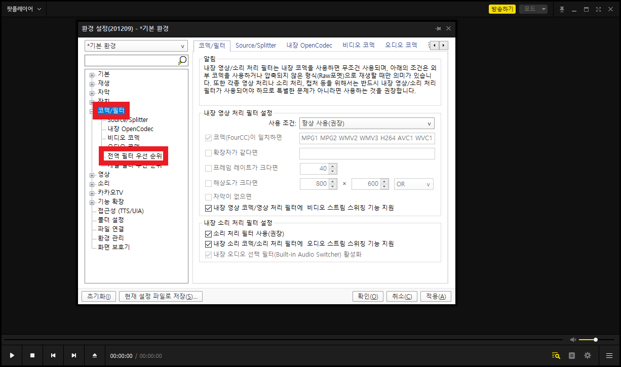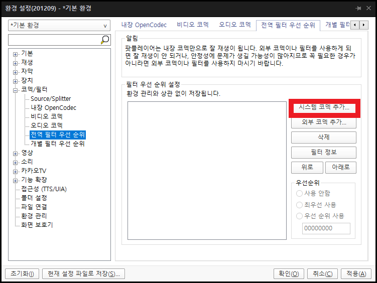 우클릭해서 환경설정 창으로 들어가시거나 F5를 눌러주시면 위와 같은 환경설정이 뜹니다. 코덱/필터를 클릭하셔서 전역 필터 우선순위를 클릭합니다.