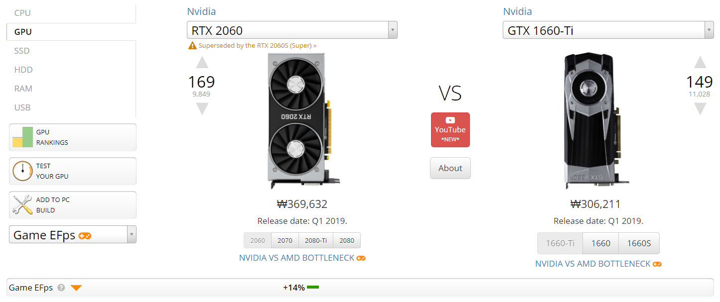 Userbenchmark 사이트에서 비교한 결과 RTX 2060이 GTX 1660 Ti에 비해 14퍼 정도 더 성능이 높은 것을 확인할 수 있습니다. RT 코어의 유무로만 차이 나서 성능이 그렇게 크게 차이가 안 난 줄 알았는데 14퍼 정도 성능 차이면 유의미한 차이가 있다고 생각됩니다.