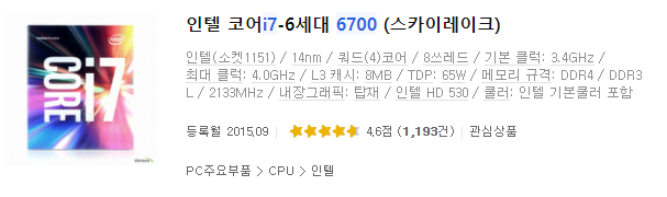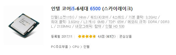 인텔 i5 6500 : 4코어 4쓰레드, 최대 클럭 3.6GHz, L3 캐시 : 6MB