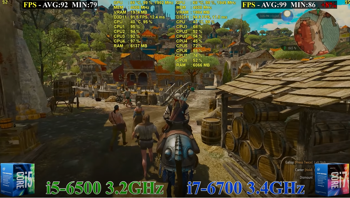 더 위쳐 3에서 플레이 영상을 보시면 GTA 5와 마찬가지로 i5 6500의 사용률이 100퍼에 가깝기 때문에 CPU가 더 힘을 못 내어 프레임이 약간 밀리는 모습을 보이고 있습니다.