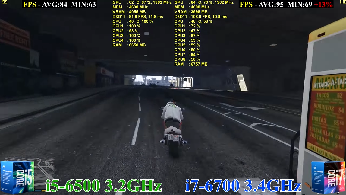 GTA 5에서 i7 6700의 평균 프레임이 11 더 높게 나온 것을 확인할 수 있습니다. 또한 i5 6500의 사용률은 보시면 100퍼를 찍은 반면에 i7 6700의 사용률은 58%로 사용률에서도 차이가 난 것을 할 수 있습니다.