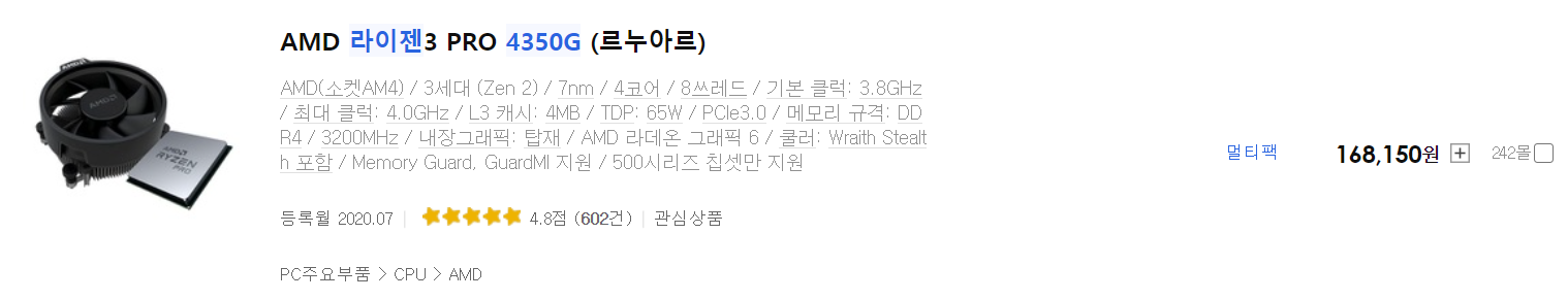 만약 신품으로 사신다고 하면 라이젠 3400G 성능과 비슷한 라이젠 4350G와 A520 보드로 조합하셔서 가시는 것도 추천드립니다.