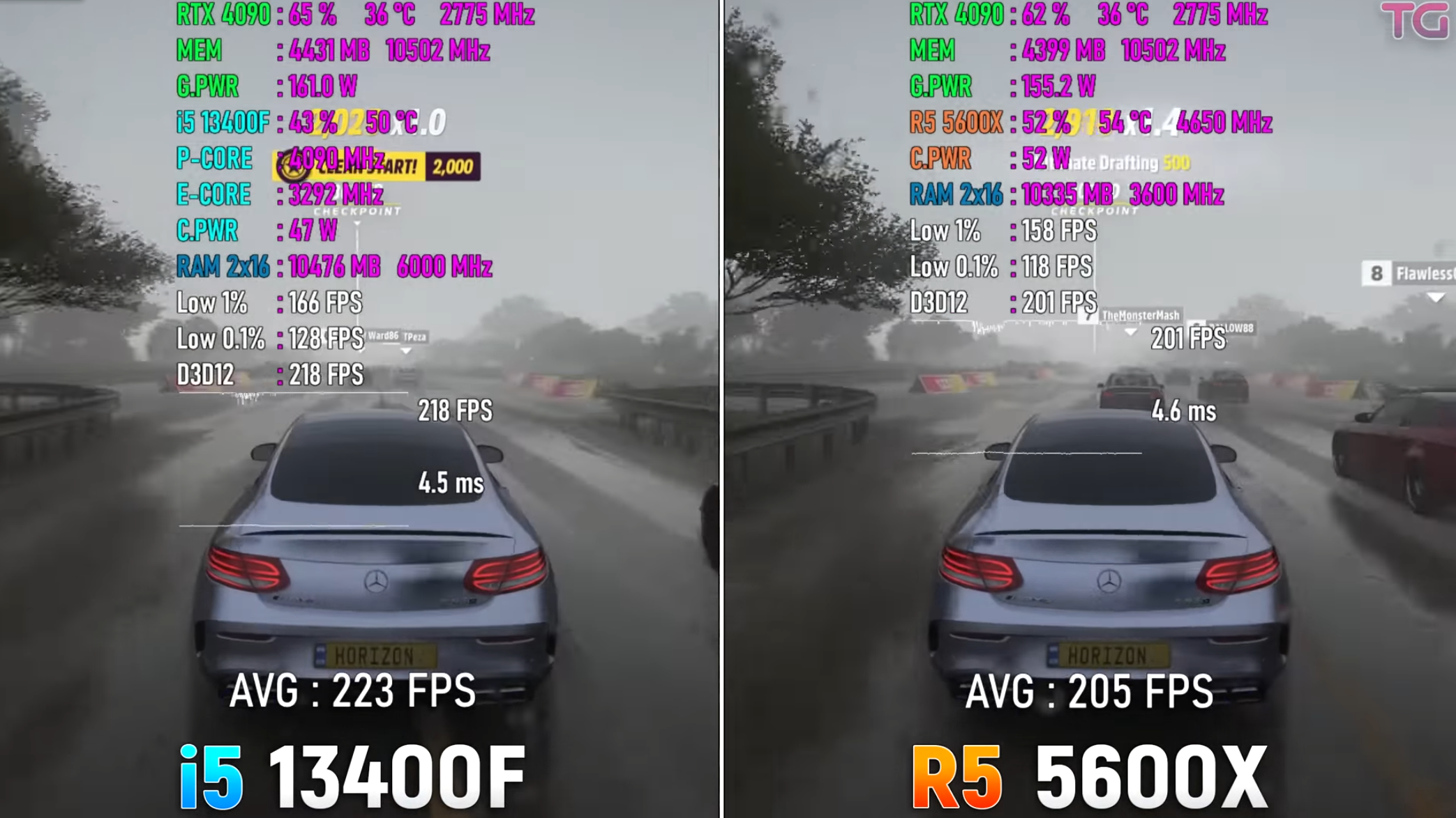 포르자 호라이즌 5 FHD 기준으로 각 평균 프레임은 223, 205로 인텔 i5-13400F가 라이젠 5600X 보다 약 8% 우세한 성능을 보여주었습니다.