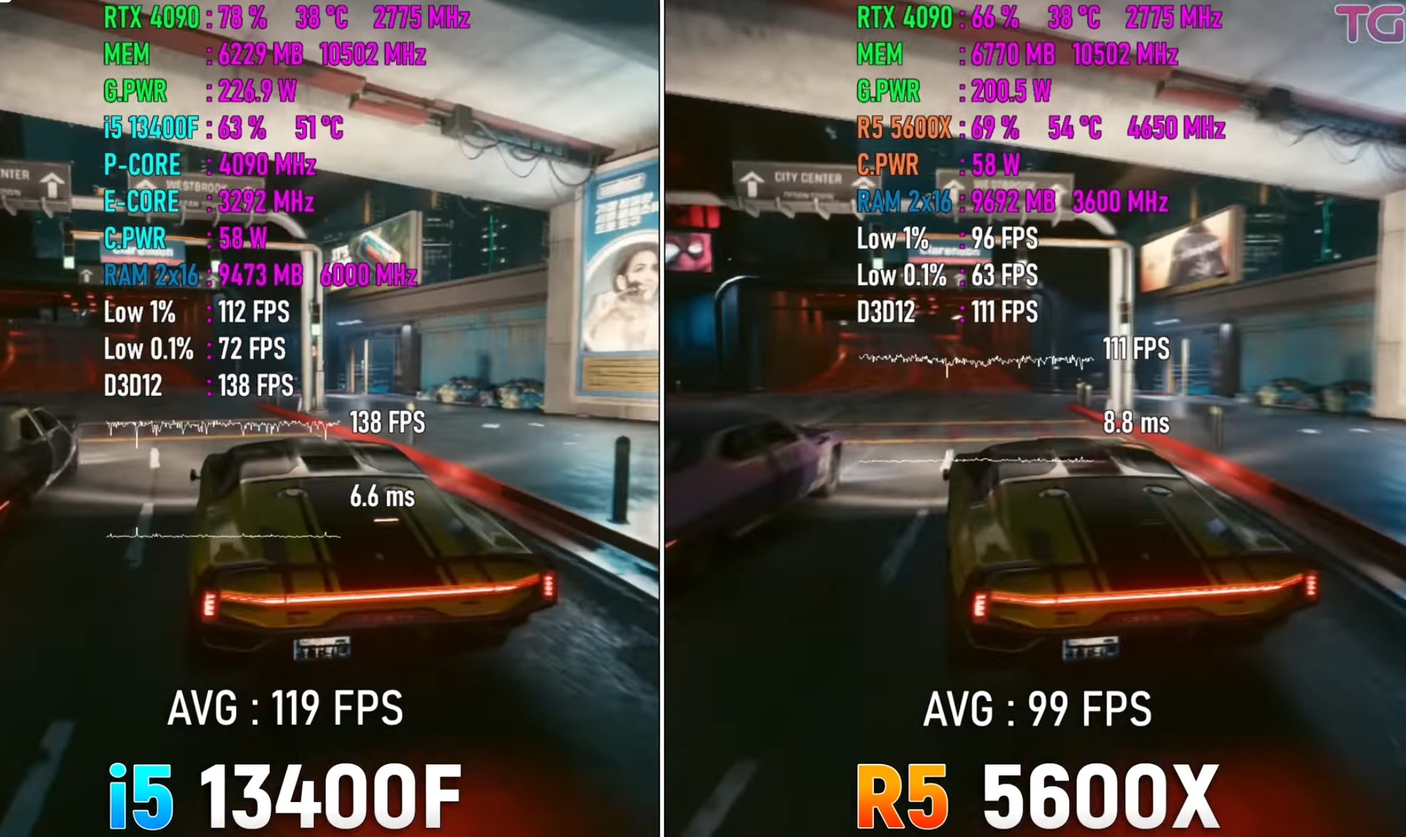 싸이버펑크 2077 FHD 기준으로 각 평균 프레임은 119, 99로 인텔 i5-13400F가 라이젠 5600X 보다 약 20% 우세한 성능을 보여주었습니다.