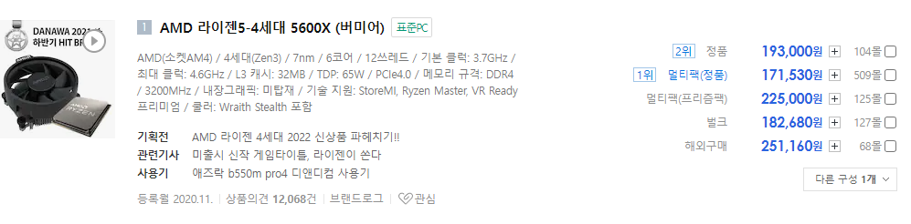 249,310(13400F, 정품) vs 171,530(5600X, 멀티팩)